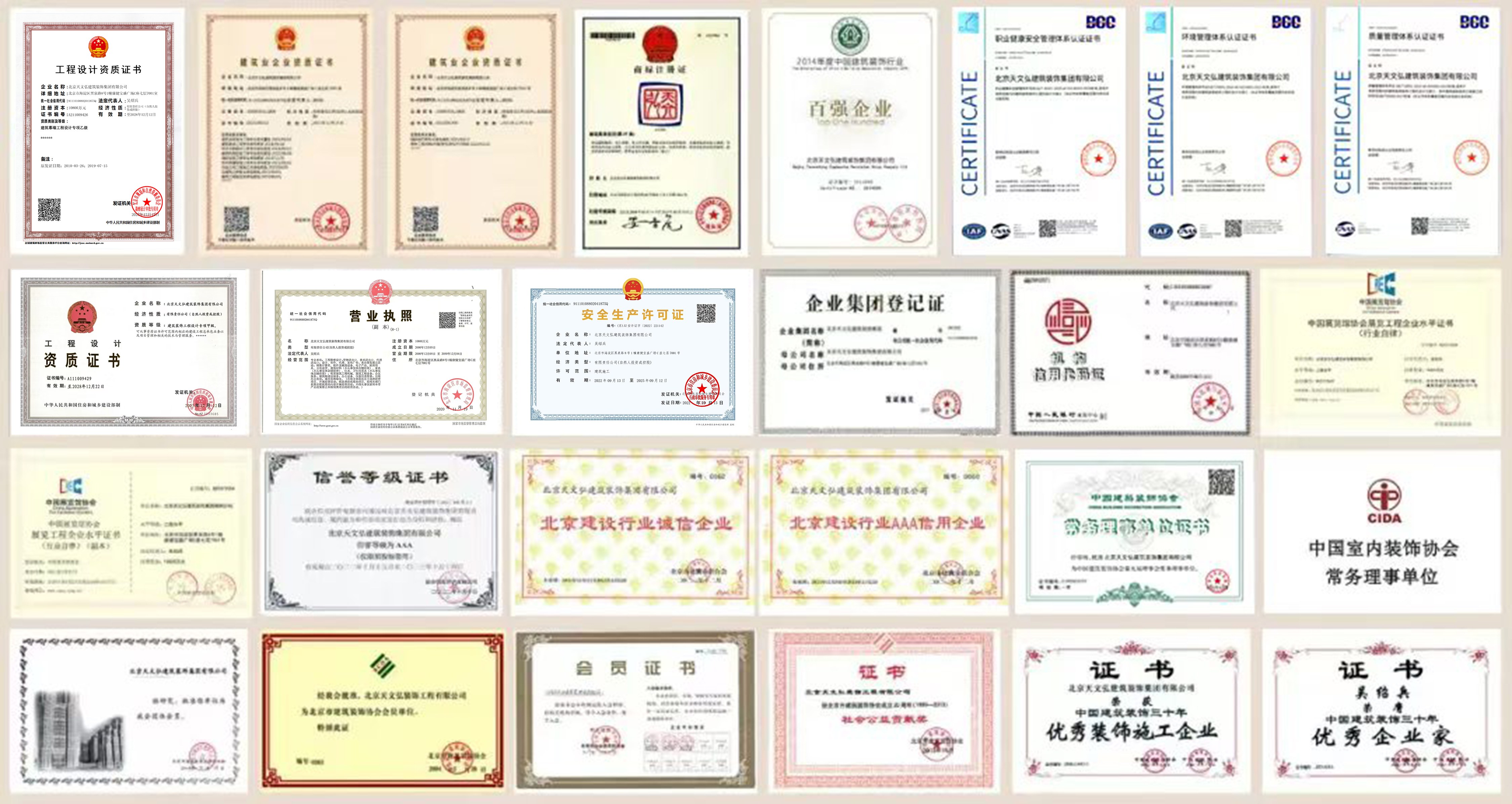 北京天文弘建筑裝飾集團有限公司,始創(chuàng)于1995年,正式成立于2000年,注冊資本10800萬元??偛课挥诒本┦泻5韰^(qū)寶盛廣場。是建設部核準的國家建筑裝飾設計甲級資質、 施工壹級資質的企業(yè);同時具有建筑工程施工總承包貳級、市政公用工程施工總承包貳級、建筑幕墻工程設計乙級、施工貳級、電子與智能化工程專業(yè)承包貳級、建筑機電安裝工程專 業(yè)承包貳級、消防設施工程專業(yè)承包貳級、防水防腐保溫工程專業(yè)承包貳級、古建筑工程專 業(yè)承包貳級、展覽陳列工程設計與施工一體化資質壹級、特種工程及鋼結構等多項資質。連 續(xù)多年通過了ISO9001質量管理體系、ISO14001 環(huán)境管理體系、ISO28001職業(yè)健康安全管理體系認證?,F(xiàn)為阿里巴巴經(jīng)濟體優(yōu)秀供應商、融創(chuàng)·中國戰(zhàn)略合作伙伴、中國建筑裝飾協(xié)會常務理事單位、北京市建筑裝飾協(xié)會副會長單位、中國建筑裝飾行業(yè)百強企業(yè)。是中央國家機關2011-2025年度工程項目定點施工企業(yè)。
